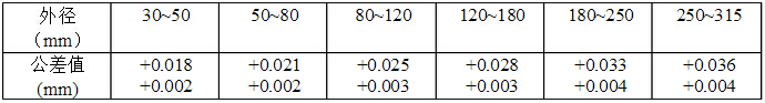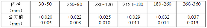 軸承與軸承室配合,其軸承套內(nèi)徑選擇公差見表二。在加工中應(yīng)盡量控制在中間公差的上偏差區(qū)間內(nèi),呈間隙配合,以保證電機(jī)在額定運(yùn)行中其軸貫通部分發(fā)熱時(shí),為熱膨脹留有一定裕度。但是軸承套加工尺寸不宜過大,否則會發(fā)生跑套現(xiàn)象,軸承更容易發(fā)熱,為此在檢修中,應(yīng)嚴(yán)格把住軸承內(nèi)、外徑實(shí)際配合精度,以保證軸承裝配后達(dá)到有限自由的穩(wěn)定運(yùn)行狀態(tài)。