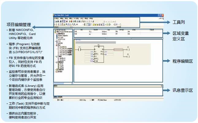 整合運(yùn)動(dòng)控制編輯:ISPSoft V3將邏輯編程與運(yùn)動(dòng)編程整合在同一套軟件上,并提供符合國際標(biāo)準(zhǔn)規(guī)格 PLCopen? 的功能塊以及臺達(dá)提供的豐富功能塊